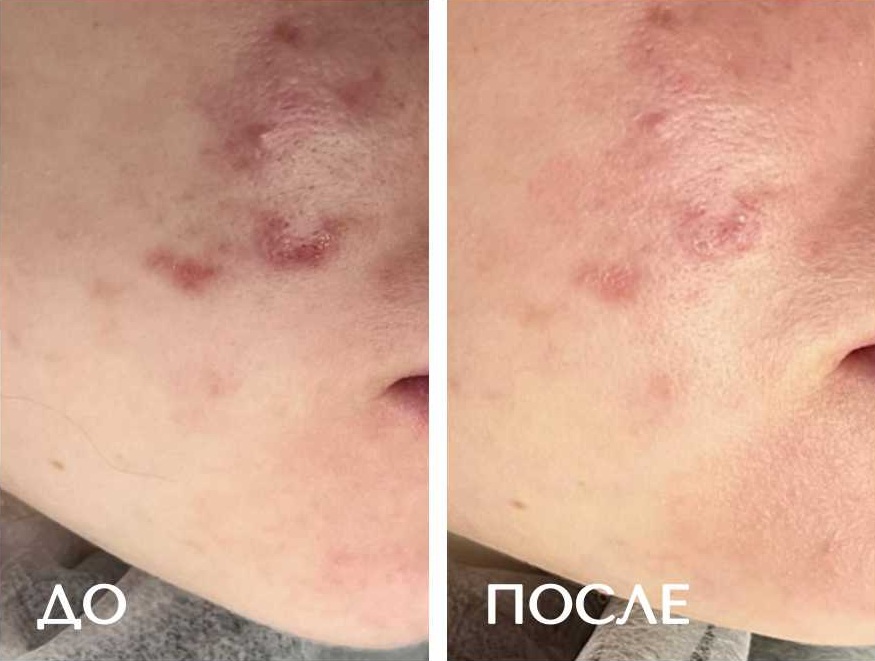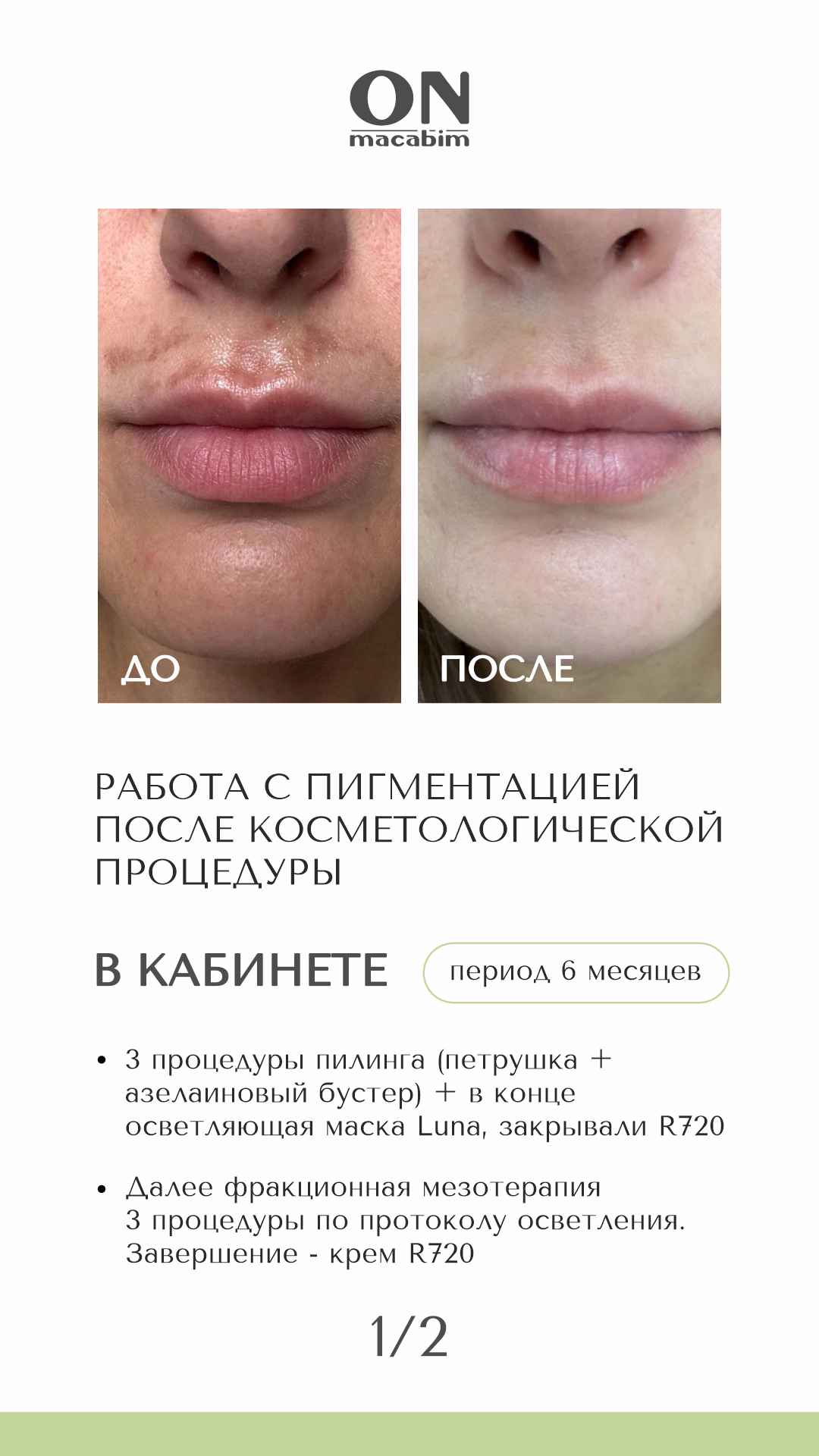 Сравните кожу "До" и "После" курса миндального пилинга ONmacabim. В работе косметолог избавил пациента от мелких высыпаний, пигментации и следов постакне. Миндальный пилинг эффективно выравнивает тон и текстуру кожи, делая ее гладкой и сияющей.